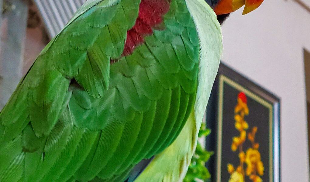 Manytimes he remain seated on the shoulder of any family member. And after going outside of the door,he flew and sit near the maingate.He never has tried to escape.He just flew because of our shocking reactions. Sister has then made him to sit on the shoulder again by showing him a candy or any exciting thing.
